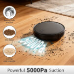 This smart robot vacuum and mop delivers 5000Pa of strong suction to easily capture dust, debris, and pet hair. Equipped with a 300ml dustbin and a 290ml electric water tank, it ensures even mopping across multiple floor types. Choose from four cleaning modes—Auto, Edge, Spot, and Random—along with three levels of suction and water flow, making it ideal for daily upkeep or tackling tough stains.