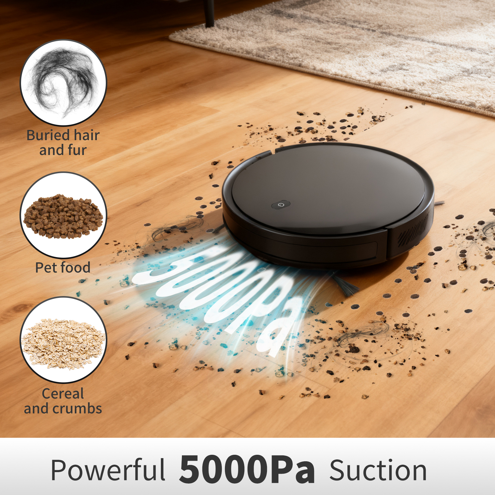 • With a super suction force of 5000 Pa and a 300 ml dust container, it can easily remove dust, debris and pet hair. The 290 ml water tank evenly absorbs water and is suitable for various floor types, including laminate flooring, tiles, granite, and solid wood flooring.