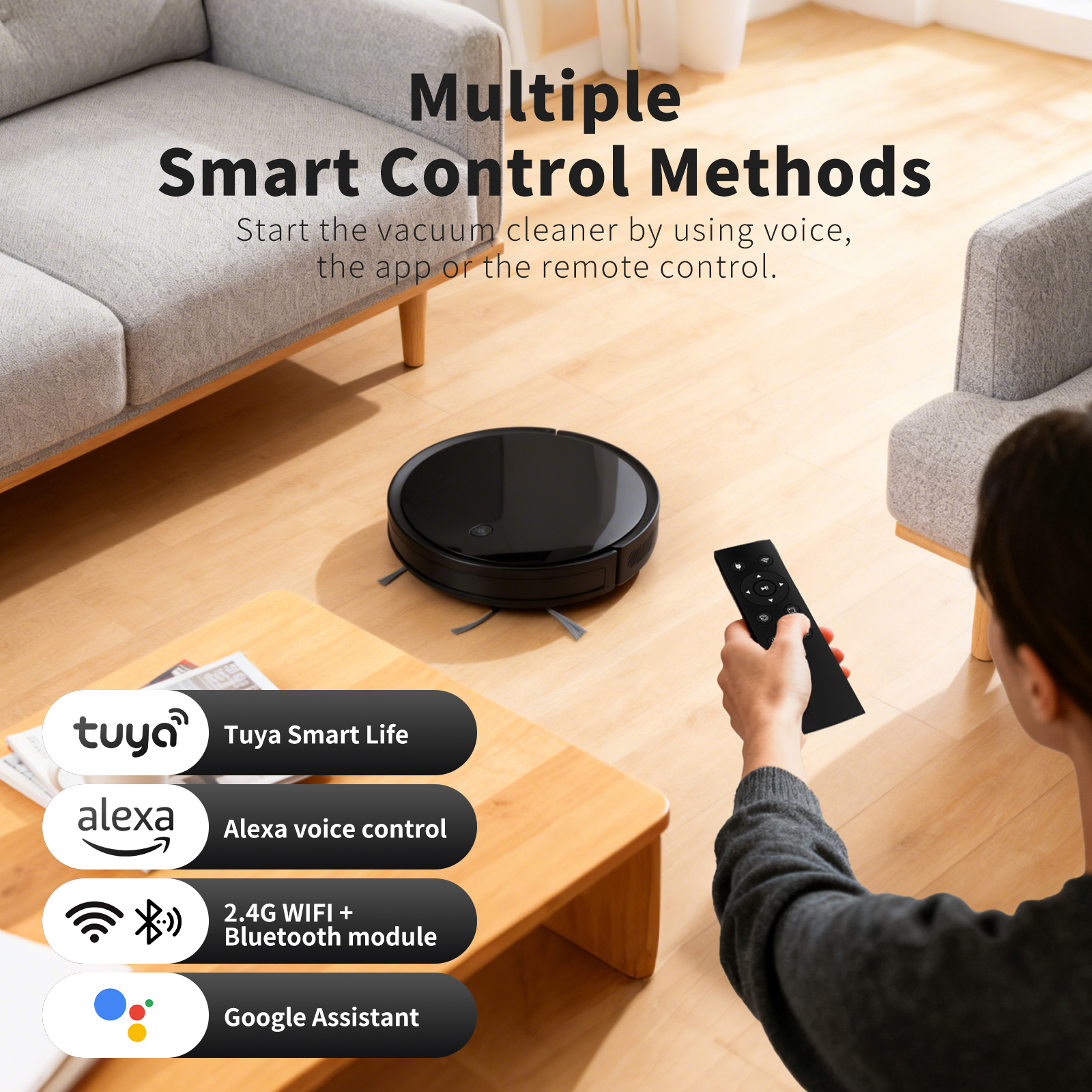 Upgraded sensors and chips enable smooth navigation around furniture and stairs—no bumps, no falls. See real-time maps and cleaning paths in the Tuya Smart App. With up to 120 minutes of runtime and automatic recharge, it cleans thoroughly and returns to base on its own. Control by app, voice (Alexa/Google Assistant), or remote—effortless for the whole family.